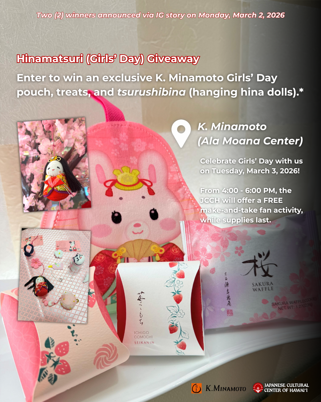 HINAMATSURI (GIRLS' DAY) GIVEAWAY: Enter to win one of two exclusive K. Minamoto Girls’ Day pouches, treats, and tsurushibina (hanging hina dolls).* Click the image below to enter the giveaway on our Instagram post (an Instagram account is required to enter).