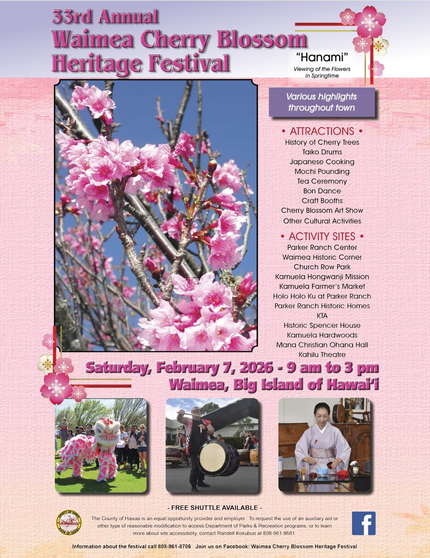Join us at the 33rd Annual Waimea Cherry Blossom Heritage Festival. Our booth will feature interactive uchiwa (fan) and hachimaki (headband) stamping and educational information. We will be located at Kamuela Hongwanji Mission.