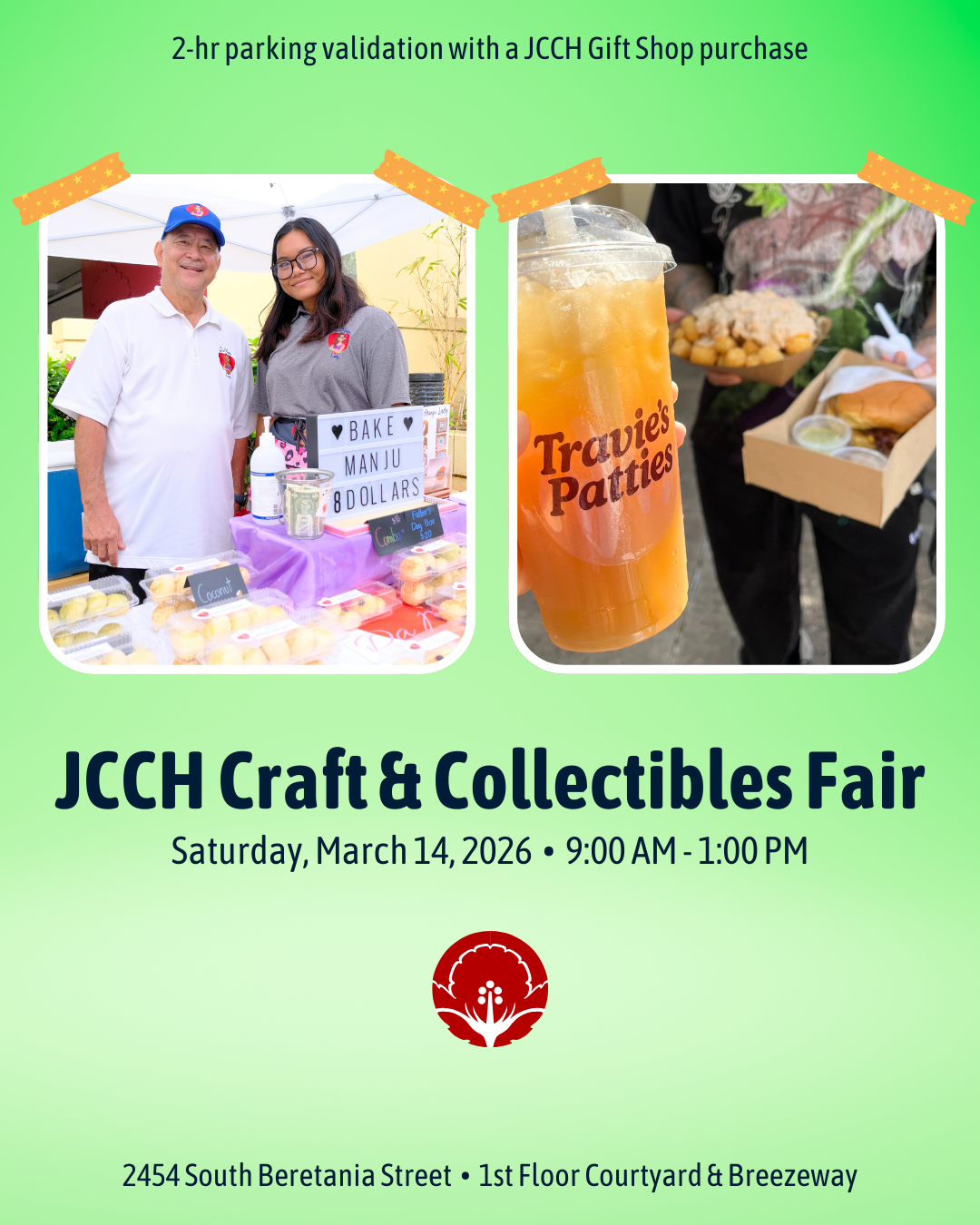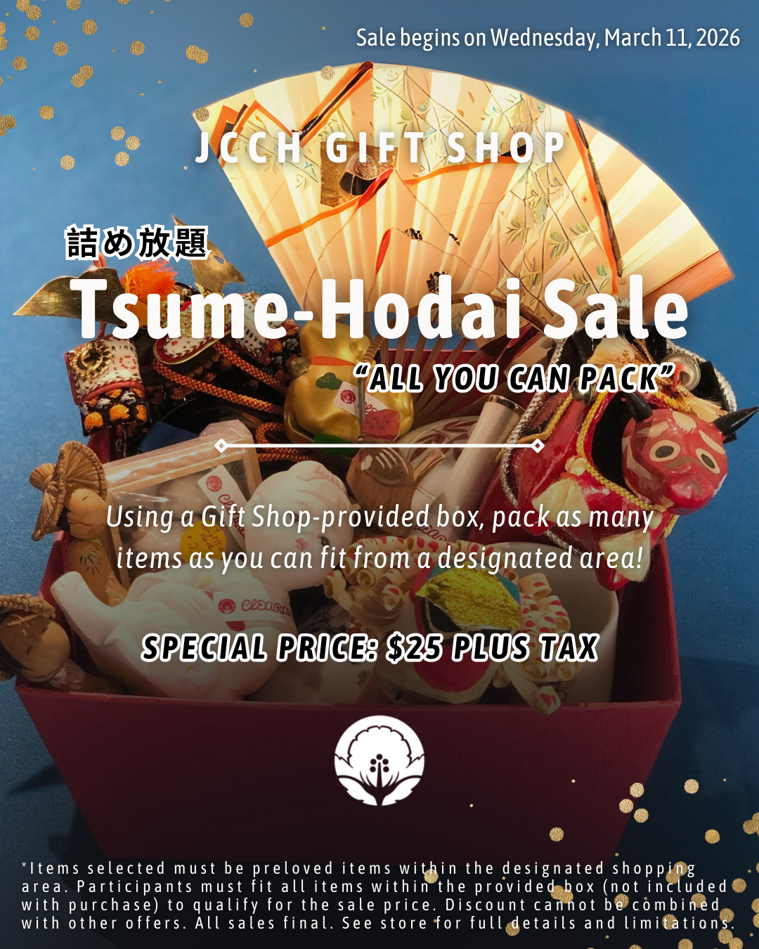 *Free event admission. 2-hr parking validation with a JCCH Gift Shop purchase. Tsume-Hodai Sale selected items must be preloved items within the designated shopping area. Participants must fit all items within the provided box (not included with purchase) to qualify for the sale price. Discount cannot be combined with other offers. All sales final. See store for full details and limitations.
