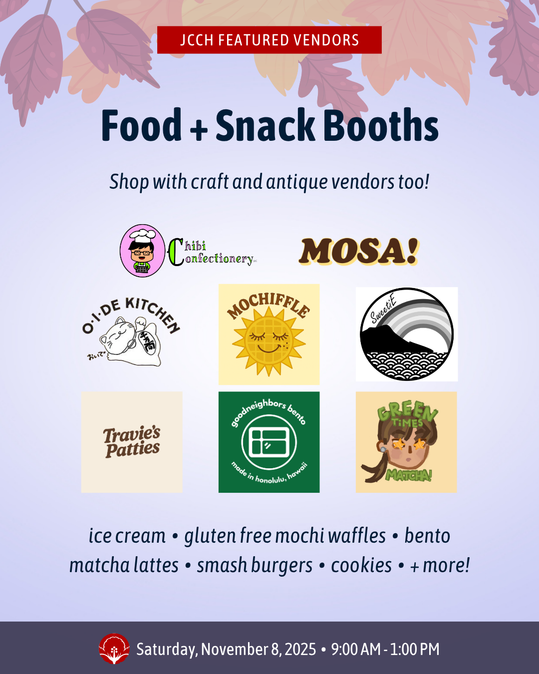 FOOD + SNACKS: Chibi Confectionery • Green Times Matcha • goodneighbors bento • Mochiffle • MOSA! • O•I•DE Kitchen • SweetiE • Travie's Patties