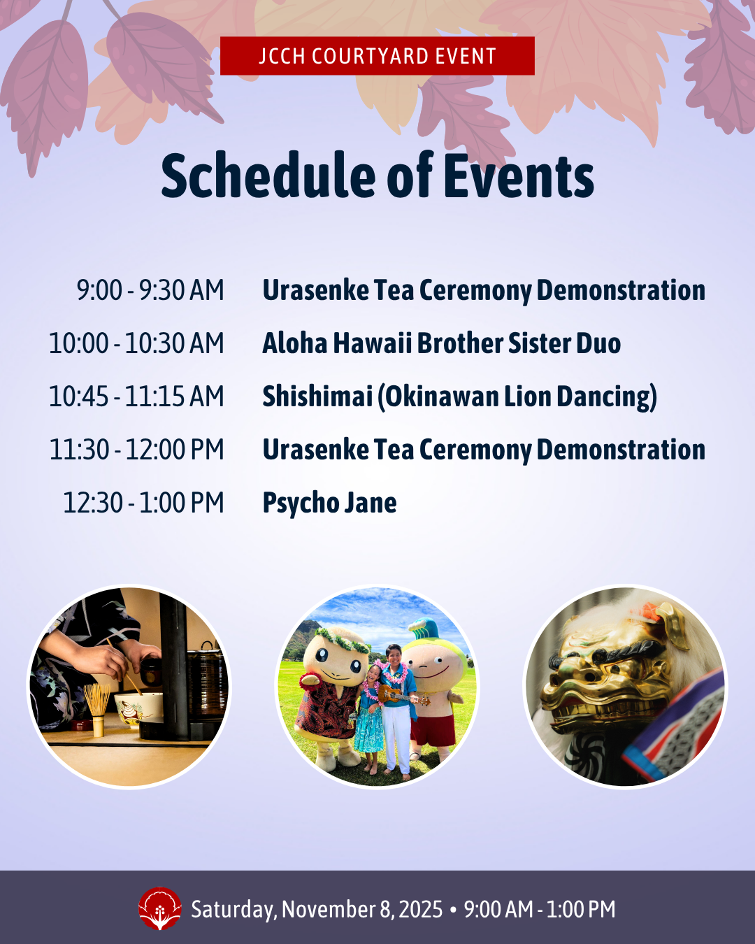 PERFORMANCES + DEMONSTRATIONS: Aloha Hawaii Brother Sister Duo • Shishimai (Okinawan Lion Dancing) • Psycho Jane • Urasenke Tea Ceremony Demonstration