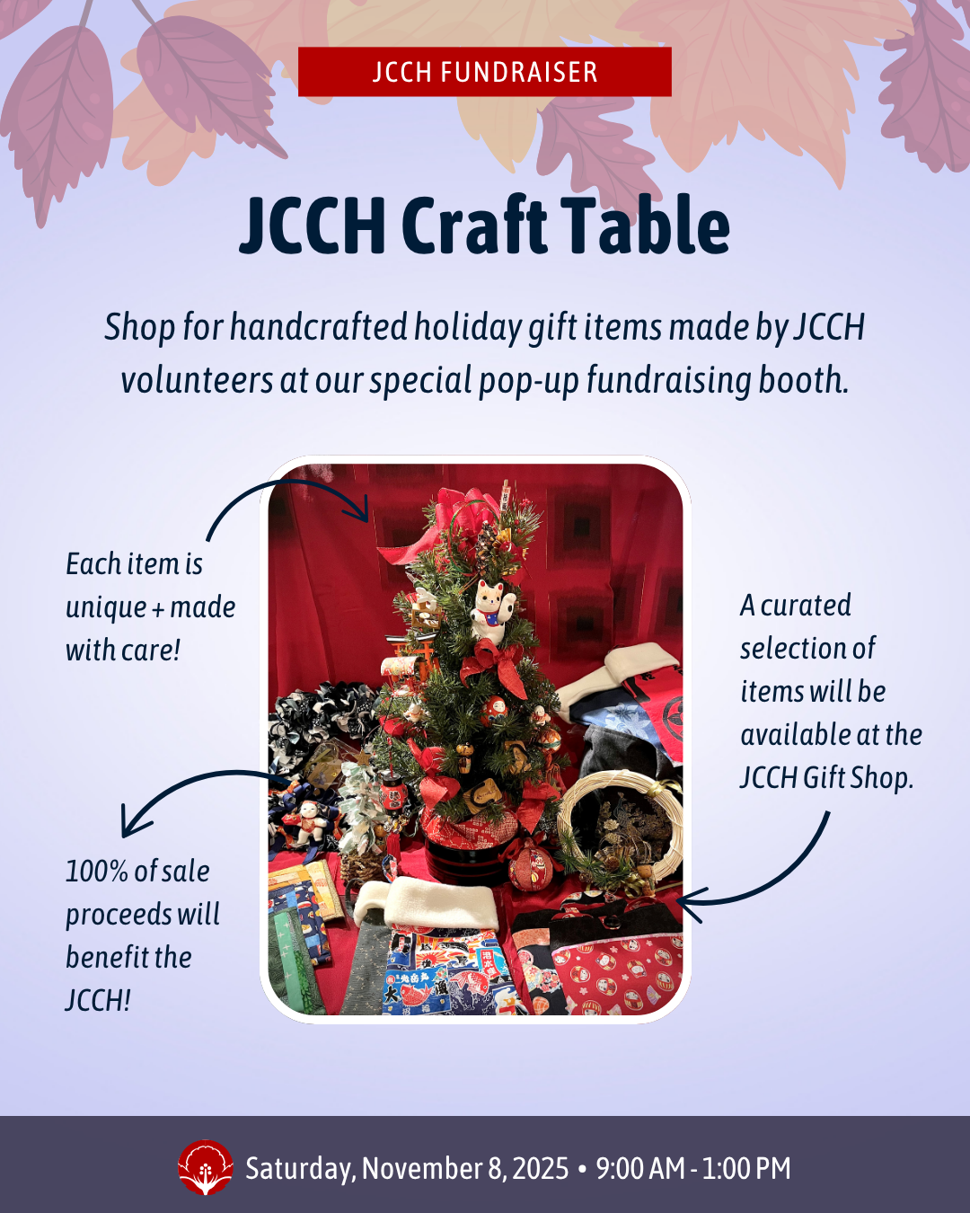 JCCH CRAFT TABLE: Shop for handcrafted holiday gift items made by JCCH volunteers at our special pop-up fundraising booth. 100% of sale proceeds will benefit the JCCH!