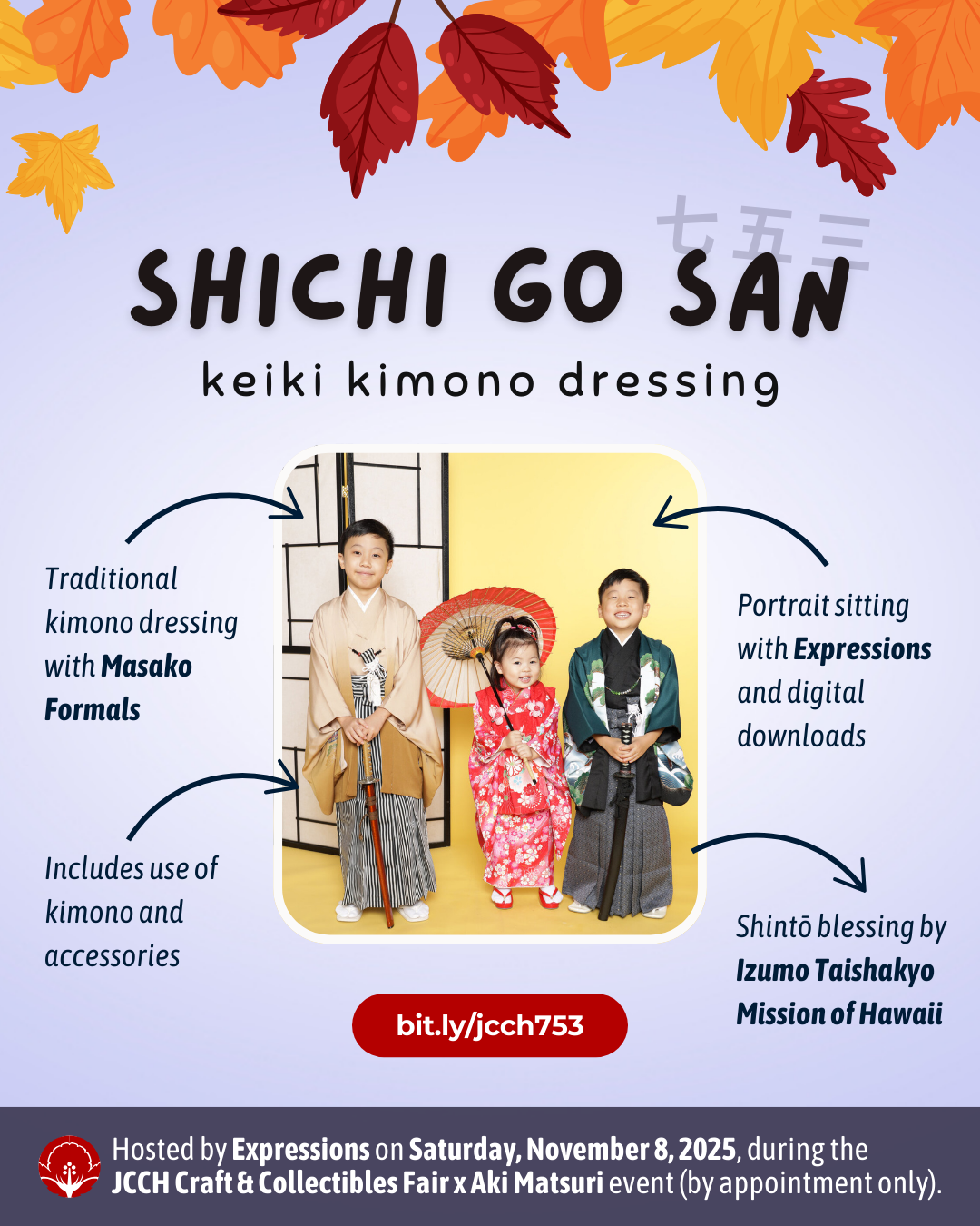 This year's keiki kimono dressing event will be hosted by Expressions during the JCCH Craft & Collectibles Fair x Aki Matsuri event in November. Participation is by appointment only. Please contact Expressions directly at [email protected] or (808) 951-7827 for all Shichi Go San inquiries.